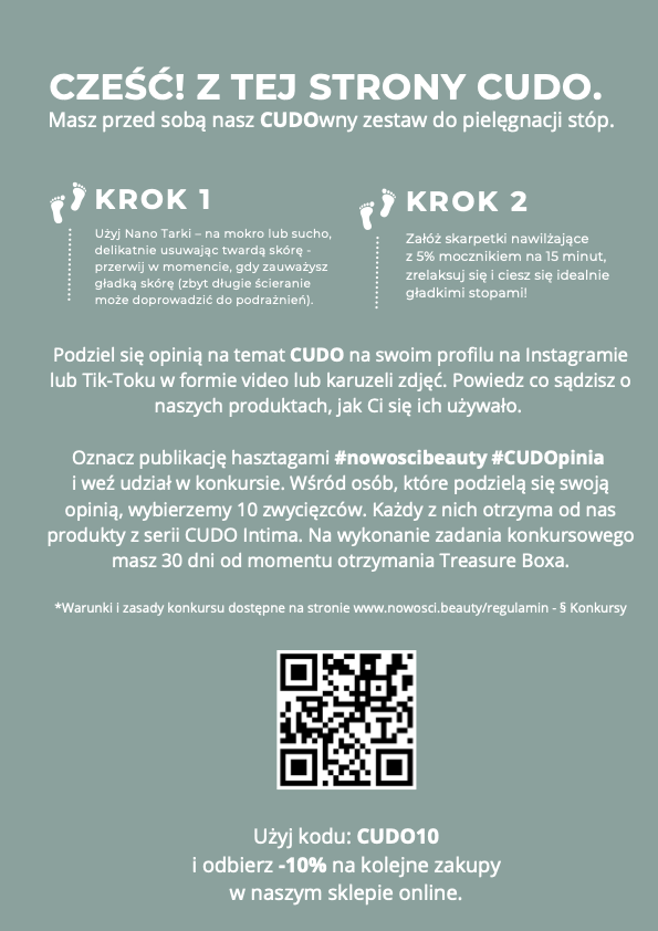 Przetestuj produkt z boxa, podziel się swoją opinią na jego temat i weź udział w konkursie. Masz możliwość zdobycia wyjątkowych nagród, jakie przygotowała dla Ciebie marka CUDO. Zapoznaj się ze szczegółami konkursu.