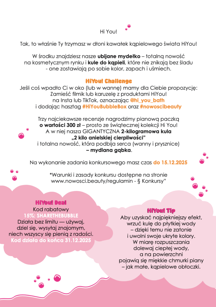 Przetestuj produkt z boxa, podziel się swoją opinią na jego temat i weź udział w konkursie. Masz możliwość zdobycia wyjątkowych nagród, jakie przygotowała dla Ciebie marka Hi You!. Zapoznaj się ze szczegółami konkursu.